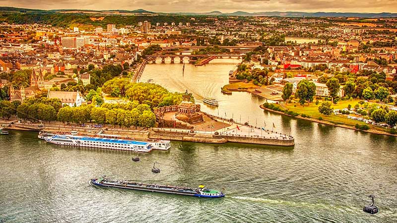Fremme i Koblenz, lægger vi til kajs ved Deutsches Eck, som er en landtange og hvor Mosel munder ud i Rhinen.