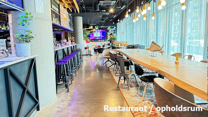 Hotel Moxy By Marriott City har også en dynamisk lobby med en 24-timers bar, der serverer cocktails og snacks i en hyggelig loungeatmosfære – et ideelt sted at slappe af eller mødes med venner.
