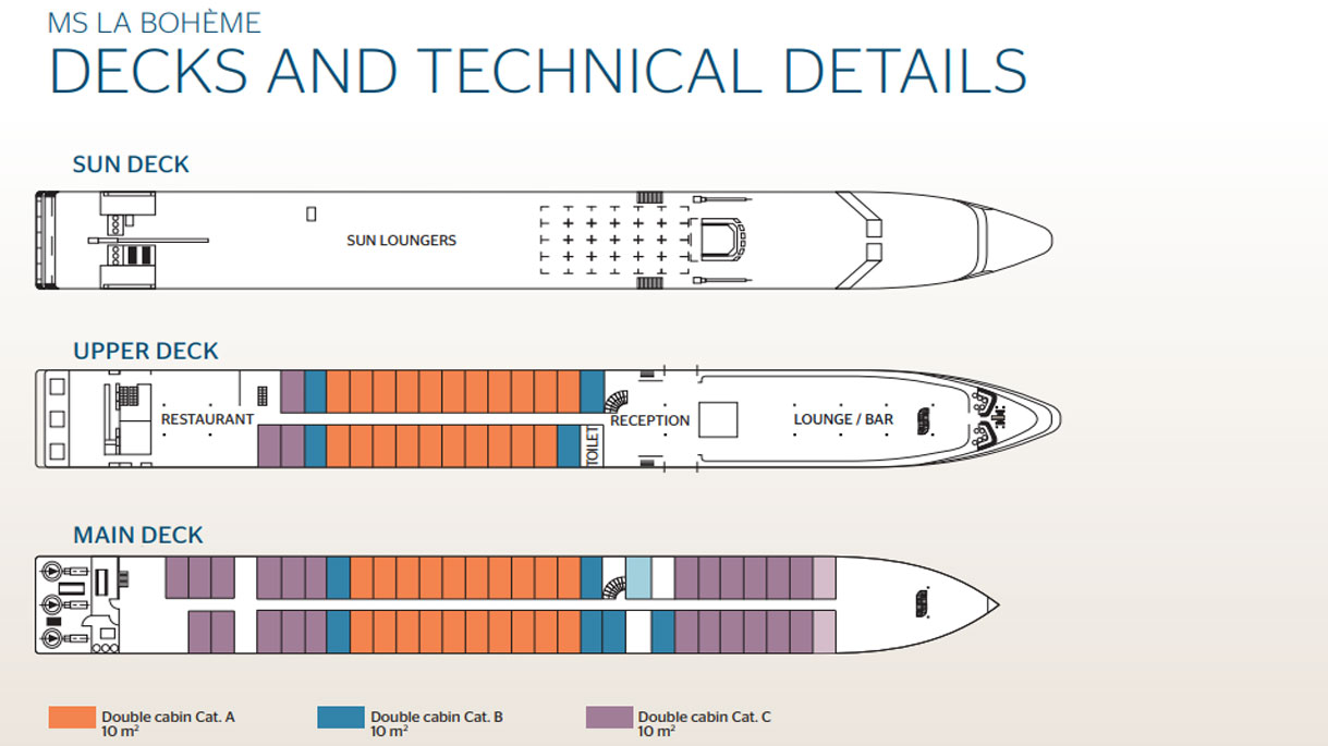 MS Boheme er et elegant men hyggeligt skib, med soldæk, hoveddæk og øvredæk, der leverer stilfuld komfort til sine 158 passagerer fordelt på 79 kahytter.