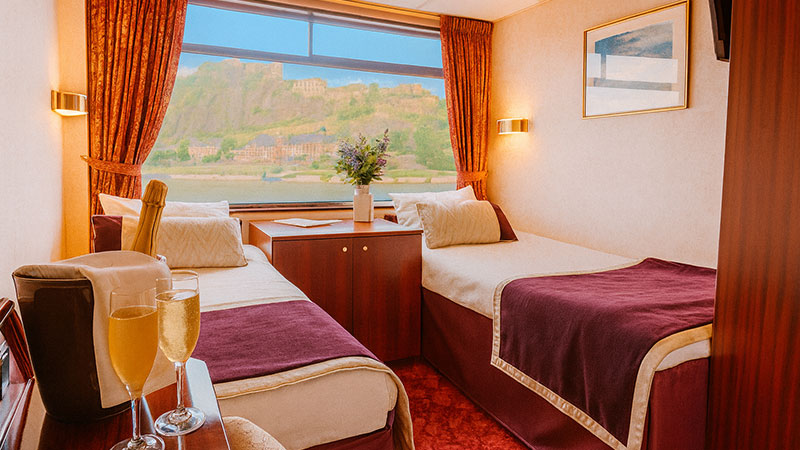 Kahytterne er lyse og funktionelle, alle udstyret med aircondition, TV, Wi-Fi, bad, toilet og hårtørrer. Vælg mellem forskellige kahytskategorier – alle med udsigt til de foranderlige landskaber langs floden.