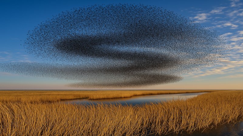 Oplev naturfænomenet Sort Sol, når stære på træk samles i store flokke i Tøndermarsken ved Vesterhavet.